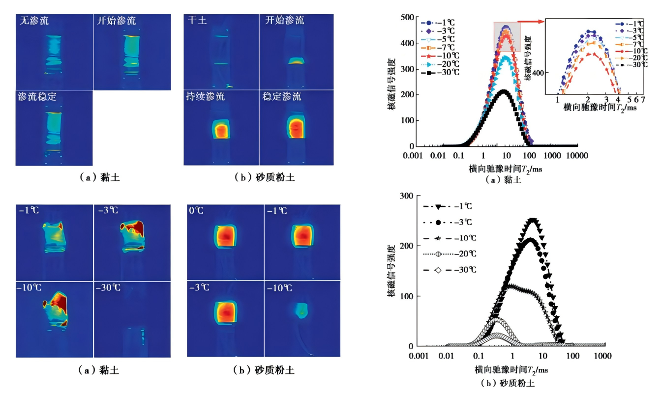周洁等(2025)在《岩土工程学报》中介绍了自主研发的低温三轴多相渗流核磁共振成像系统,开展了人工冻结黏土与砂质粉土在渗流作用下的水分迁移及压融试验。该系统可同步施加温度、围压、轴压与渗流边界,实时获取土体内部未冻水含量变化与水分分布图像。研究发现,冻结过程中未冻水含量逐渐降低,30℃时黏土与砂质粉土的未冻水含量较室温分别下降40%与93%;压融过程中,随着压力升高,冰逐渐融化为水,未冻水含量小幅增加。该研究展现了低场核磁在复杂多场耦合条件下,实现过程可视化与定量分析的独特优势。